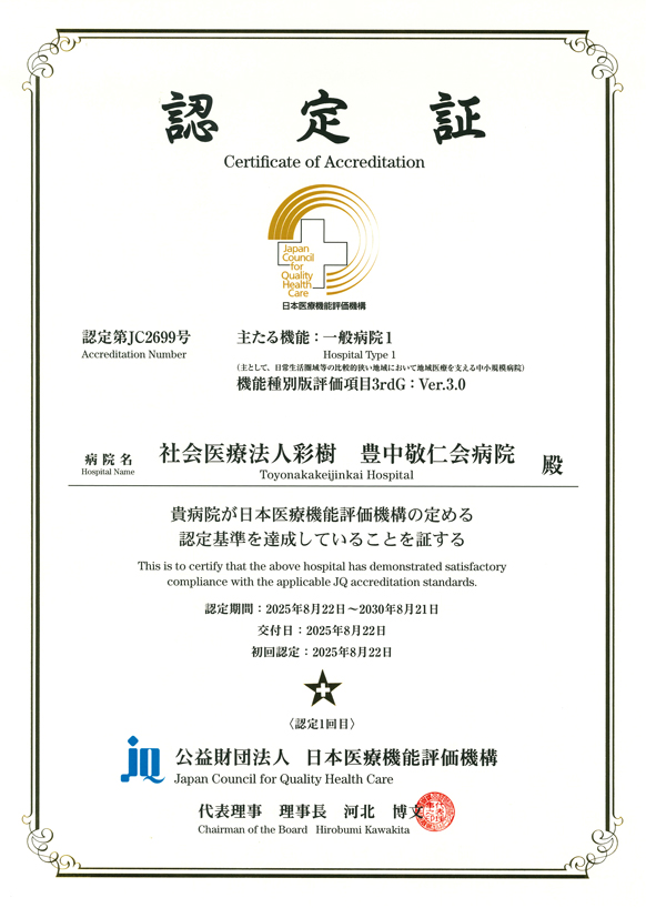 令和7年4月24・25日の2日間にわたり公益財団法人日本医療機能評価機構 (jcqhc.or.jp) が実施する病院機能評価を受審し、同機構が定める認定基準(一般病院)の基準を満たす病院として認定を受けました。