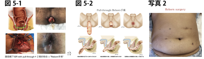 2016年からは、最終的には手術時の判断となりますが、一時的人工肛門も回避すべく、経肛門内視鏡アプローチ(taISR)を併用したPull-through/Reborn手術を行なっています(図5-1,2、写真2)。